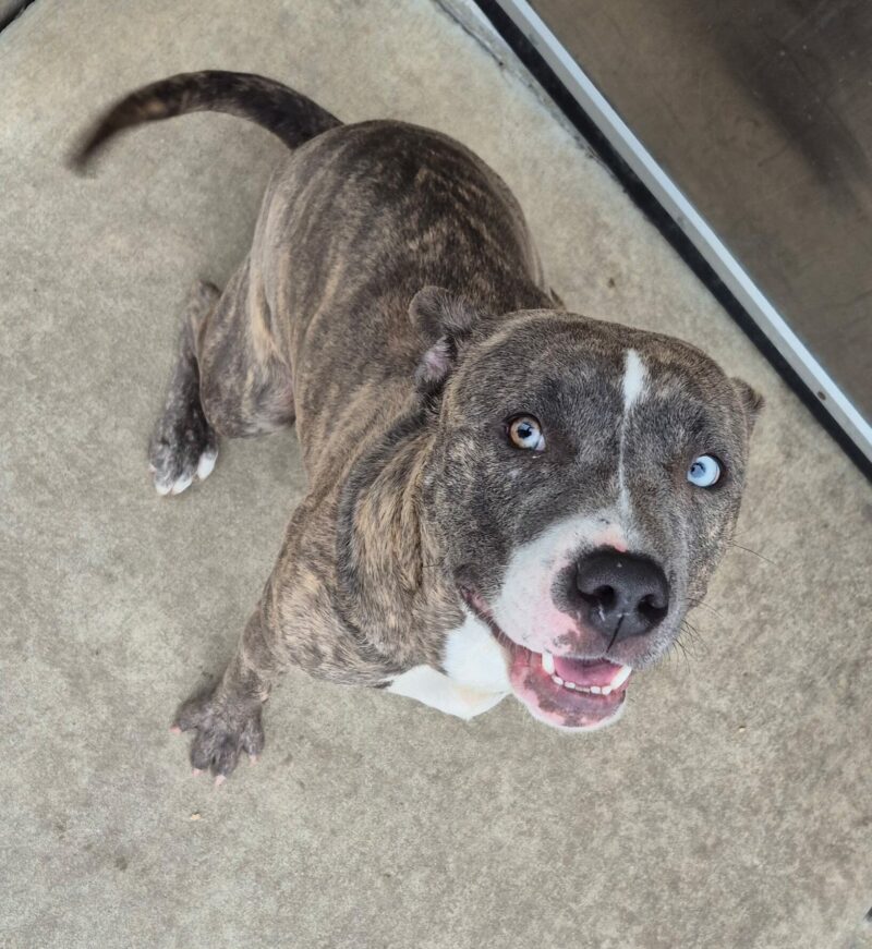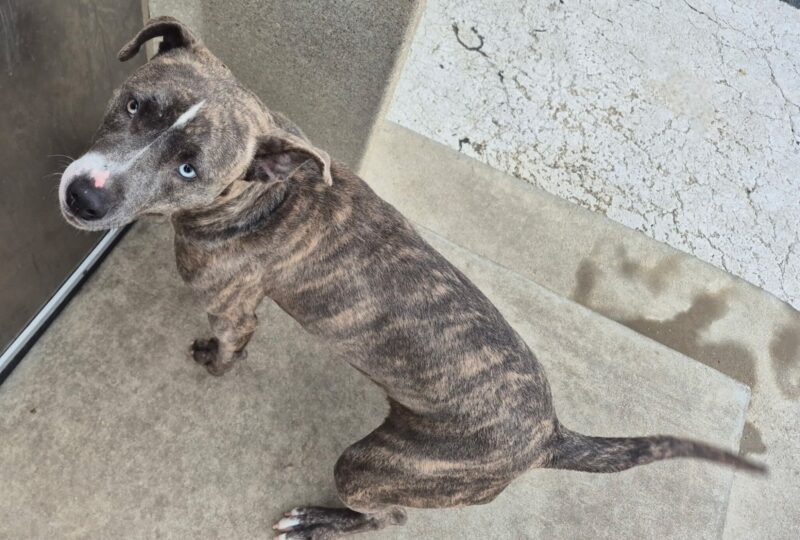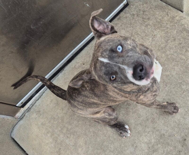 Aspen is an estimated 2-year-old female who came to us as a stray on 12/18. Her unique eyes are just one of her many great qualities! She has a beautiful, soft brindle coat and fun puppy-like energy that makes her a joy to be around. Aspen is ready to learn, play, and blossom with a family of her own!