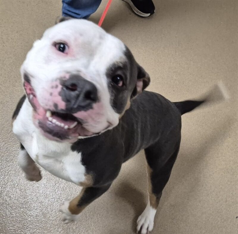 I am a neutered male, white and black Pit Bull Terrier.