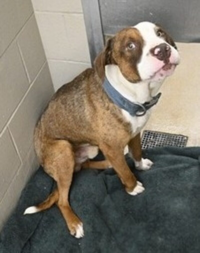 I am a neutered male, brown and white Pit Bull Terrier.